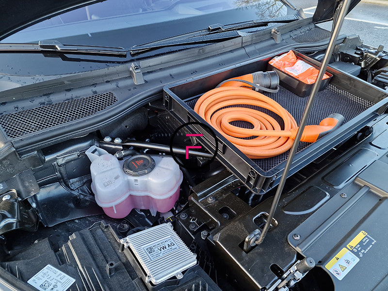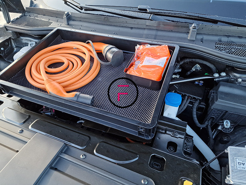 Diese Box bietet Ihnen die Möglichkeit, den sonst ungenutzten Platz unter der Motorhaube Ihres Autos zu nutzen, um z. B. das von Ihnen verwendete Ladekabel oder anderes Zubehör zu verstauen.